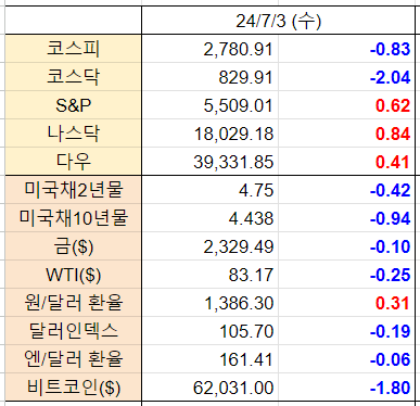 2분기 실적을 앞두고, 코스닥을 중심으로 외국인과 기관의 매물 출회가 나타났습니다. 또한, 대선 토론 이후 트럼프의 당선 가능성을 시장이 반영하면서 지수에 하방 압력을 더했습니다. 트럼프의 관세 인상 정책으로 인한 물가 자극 우려에 장기금리가 상승세를 보였기 때문입니다.